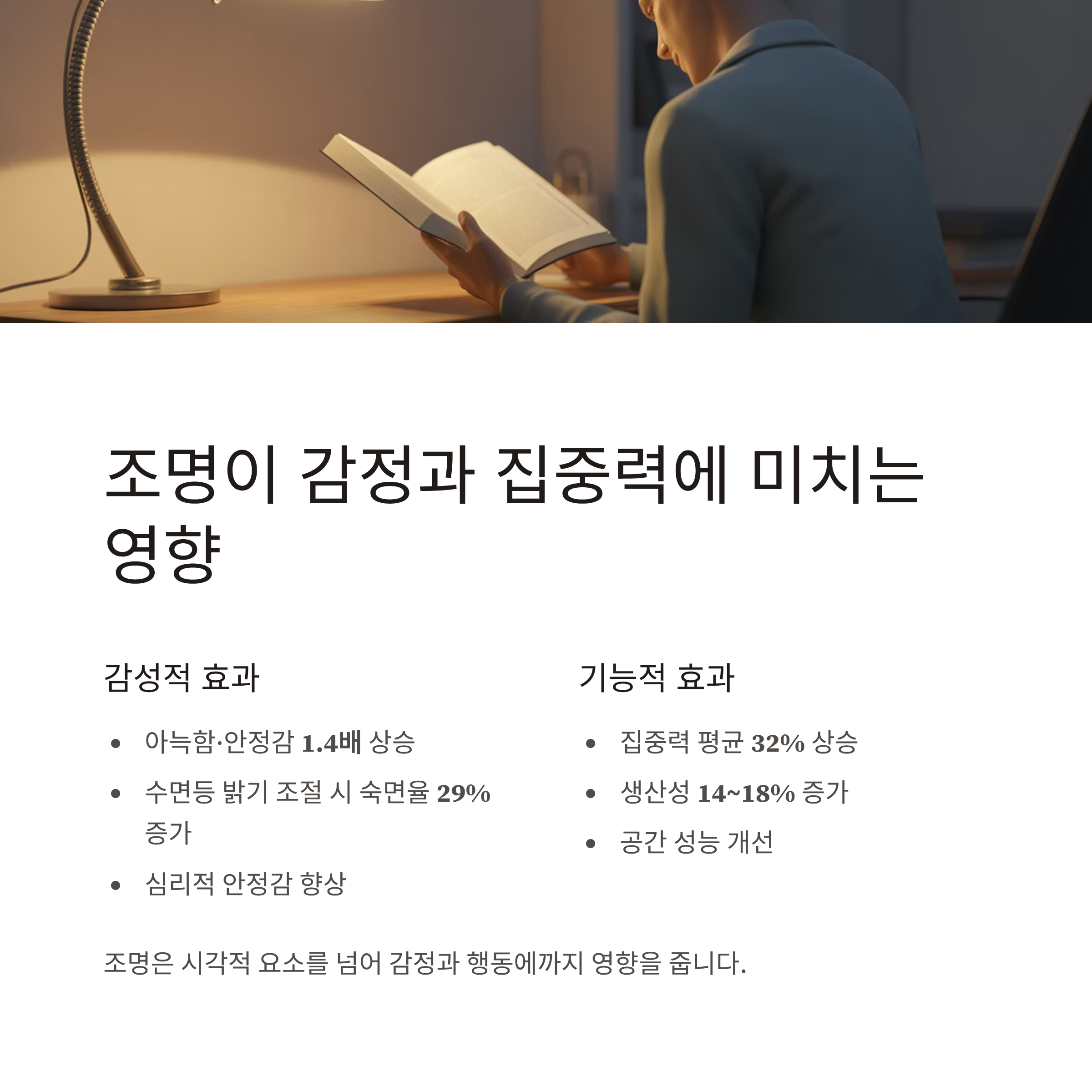 반대로 독서등이나 업무등에서 밝기를 높이면 집중력은 평균 32%, 생산성은 14~18% 상승하는 결과도 확인되었습니다.