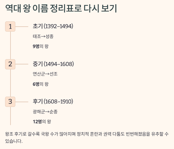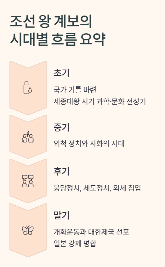 - 초반(건국기~성종): 태조–정종–태종–세종–문종–단종–세조–예종–성종