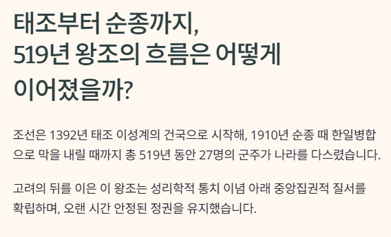 조선은 1392년 태조 이성계의 건국으로 시작해, 1910년 순종 때 한일병합으로 막을 내릴 때까지 총 519년 동안 27명의 군주가