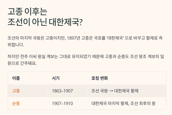 고종과 순종도 조선 왕조 계보의 일원으로 간주돼요.