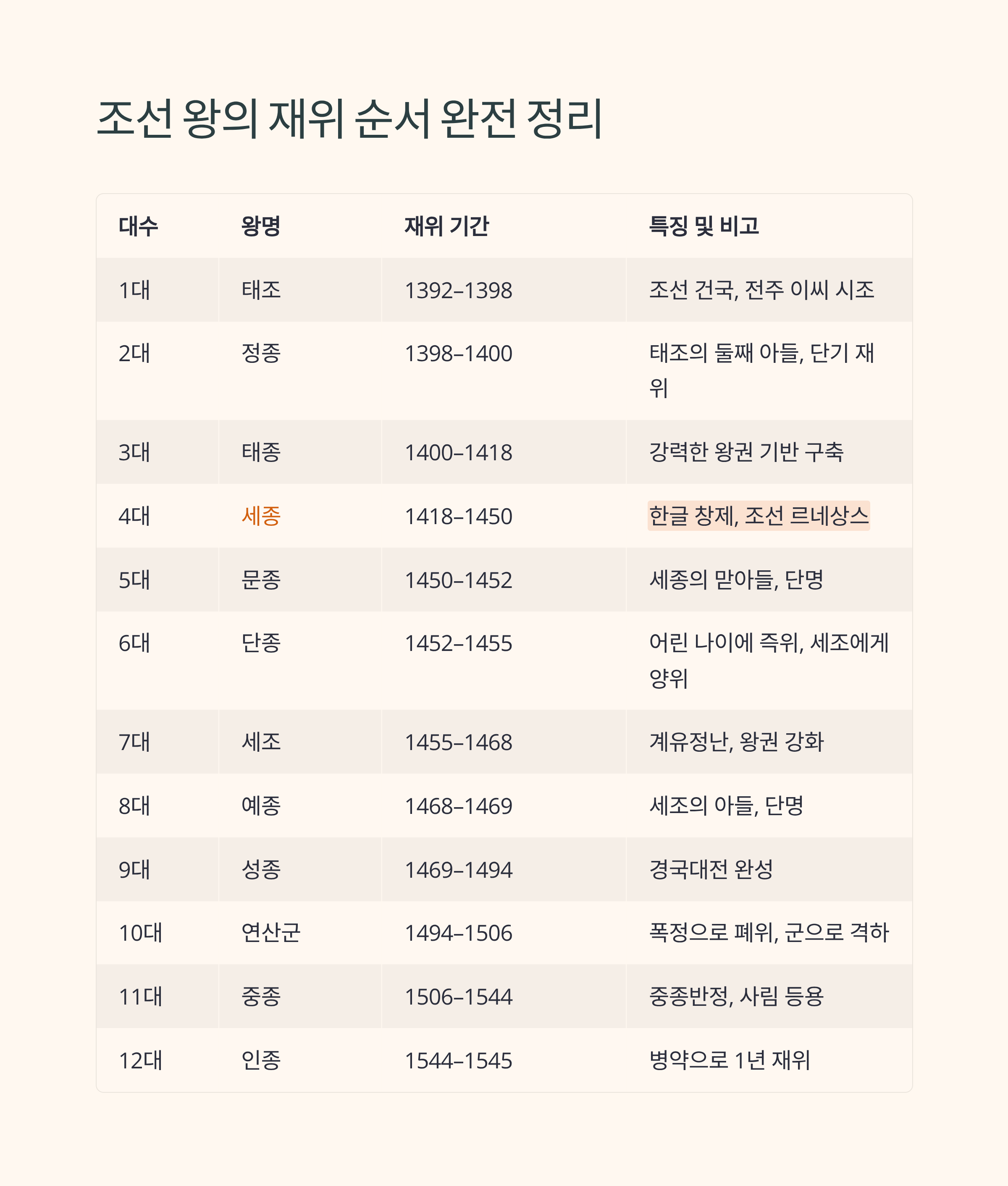 | 4대 | 세종 | 1418–1450 | 한글 창제, 조선 르네상스 |