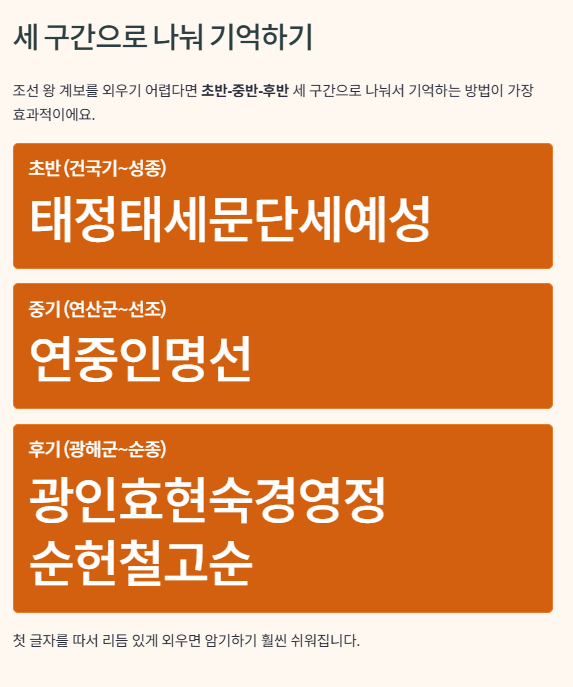 초반-중반-후반 세 구간으로 나눠서 기억하는 방법이 가장 효과적이에요.