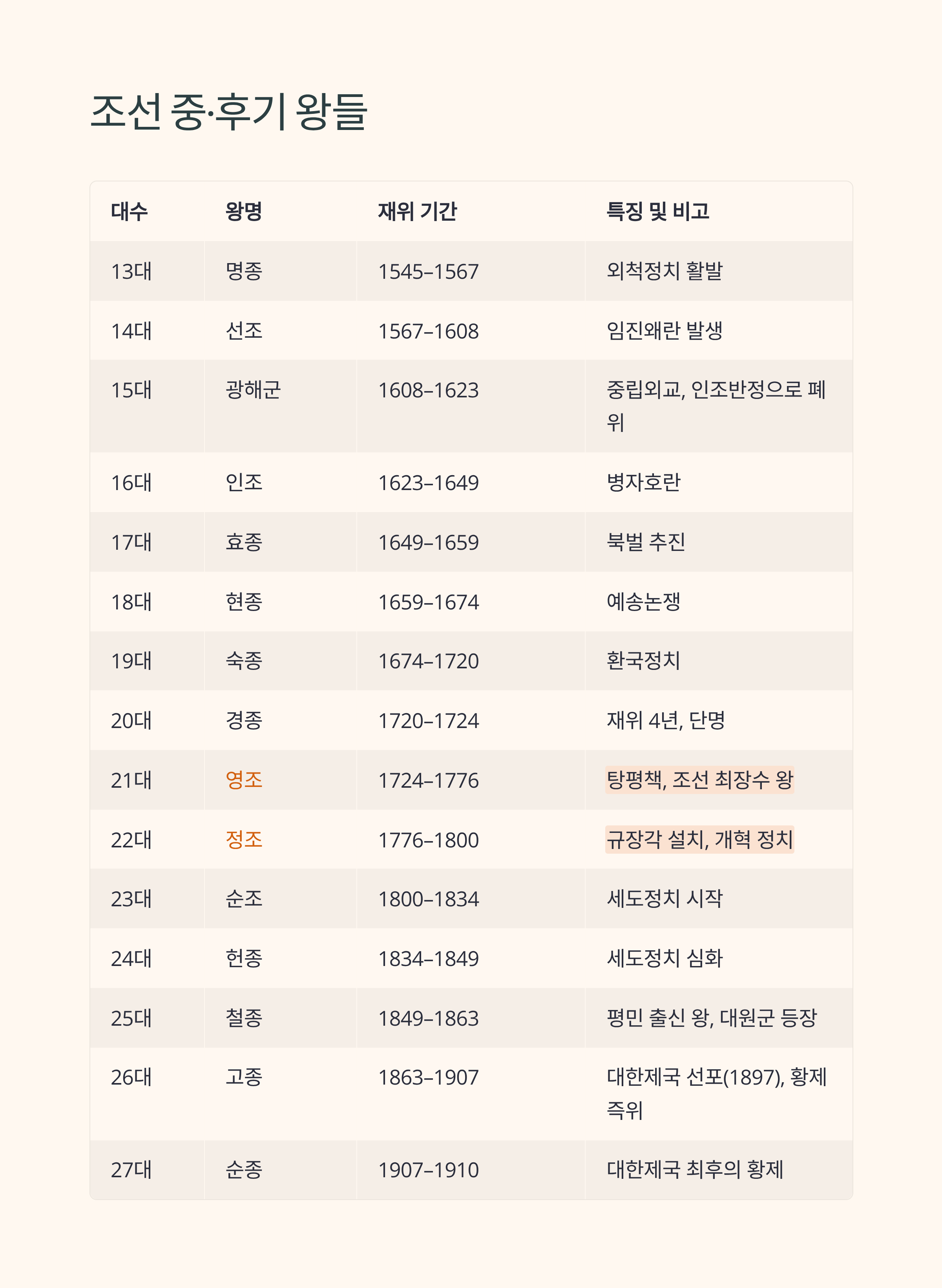 - 후기(광해군~순종): 광해군–인조–효종–현종–숙종–경종–영조–정조–순조–헌종–철종–고종–순종