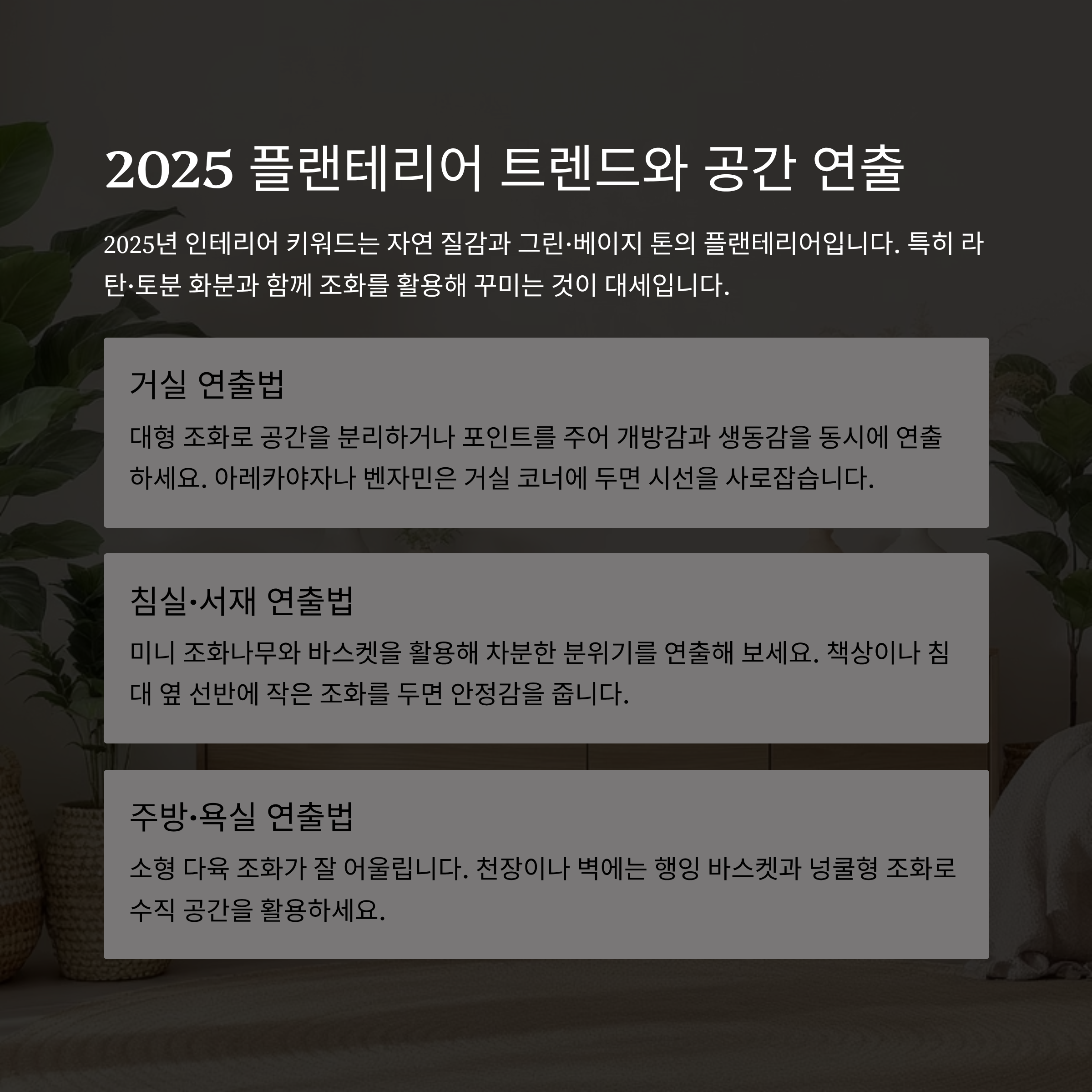 2025년 인테리어 키워드는 자연 질감과 그린·베이지 톤의 플랜테리어입니다. 특히 라탄·토분 화분과 함께 조화를 활용해 꾸미는 것이 대세입니다. 거실에는 대형 조화로 공간을 분리하거나 포인트를 주고, 침실·서재에는 미니 조화나무와 바스켓을 활용해 차분한 분위기를 연출해 보세요. 주방과 욕실에는 소형 다육 조화가 잘 어울리고, 천장이나 벽에는 행잉 바스켓과 넝쿨형 조화가 인기입니다.