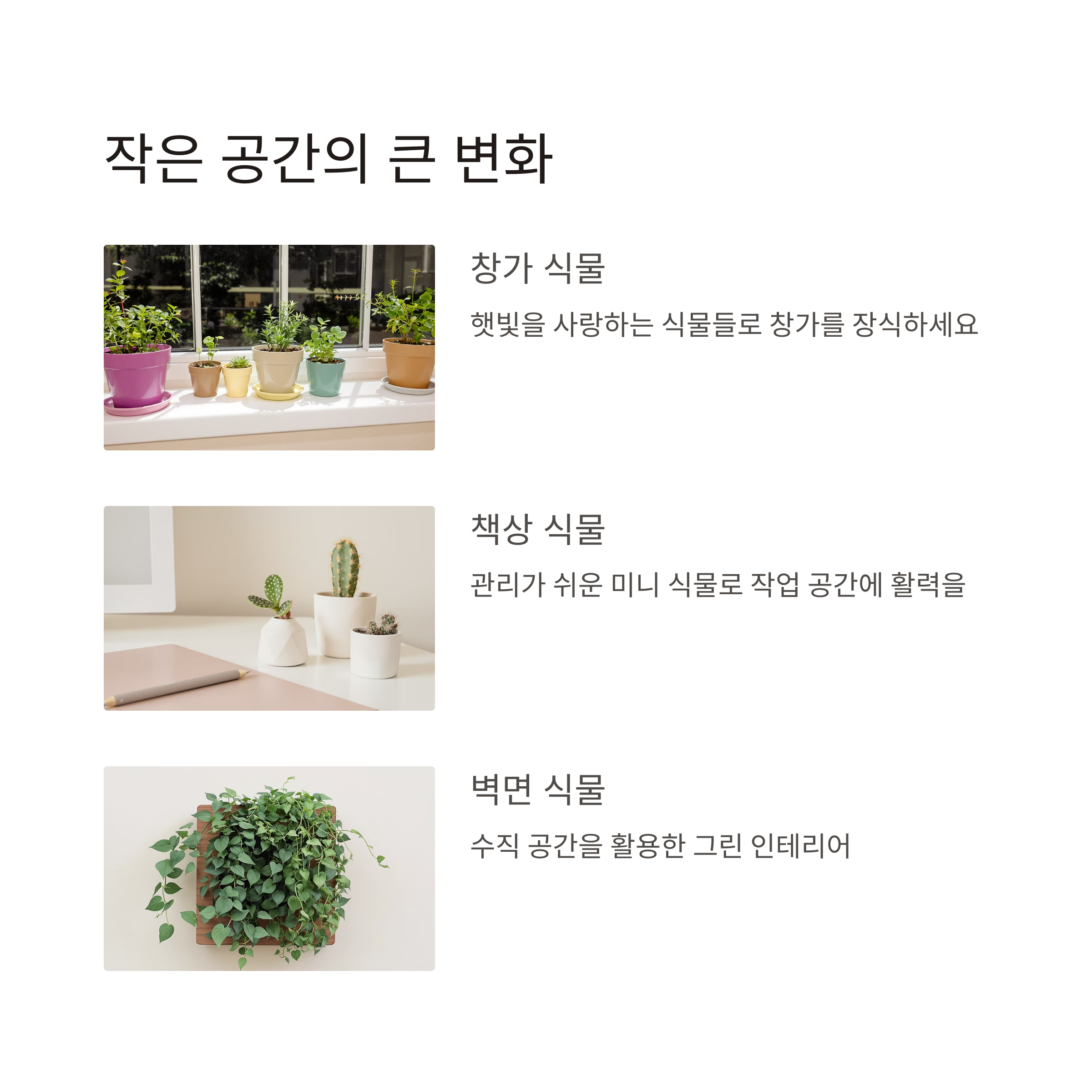 | 창가 | 선인장, 허브, 스킨답서스 | 원형/사각 소형 화분 | 햇빛이 잘 드는 곳에 배치 |