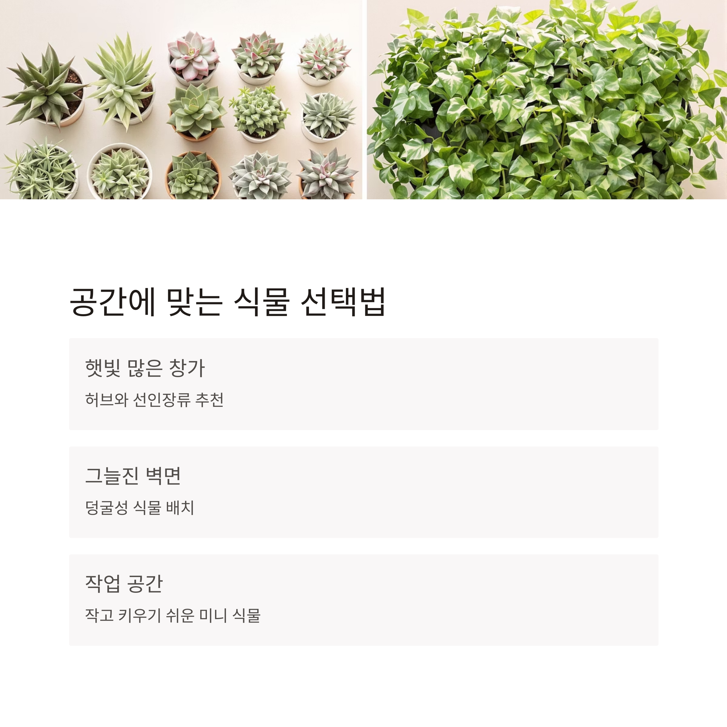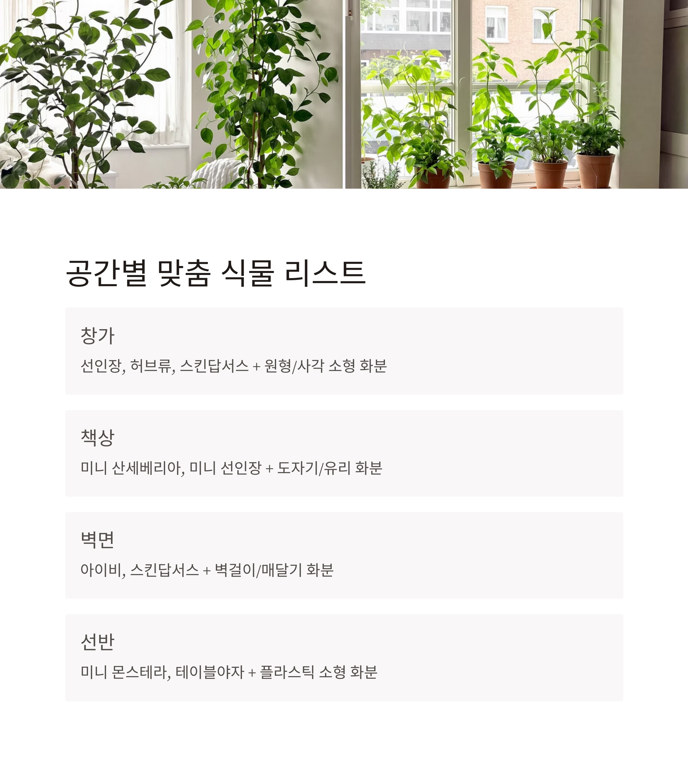 실천 요약: 공간별 맞춤 식물 리스트