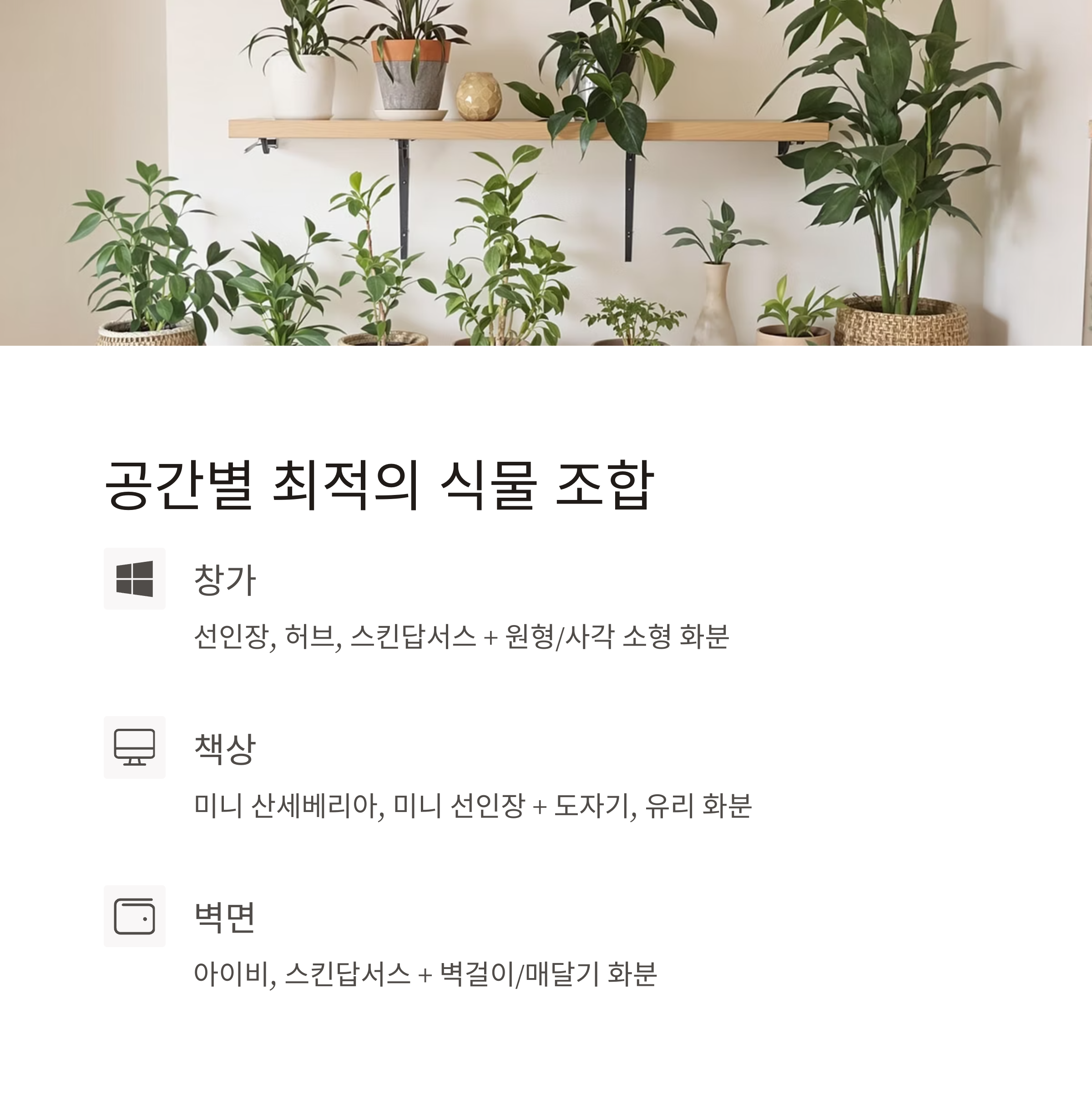 창가, 책상, 벽면, 선반 등 위치별로 추천되는 식물과 화분을 활용해