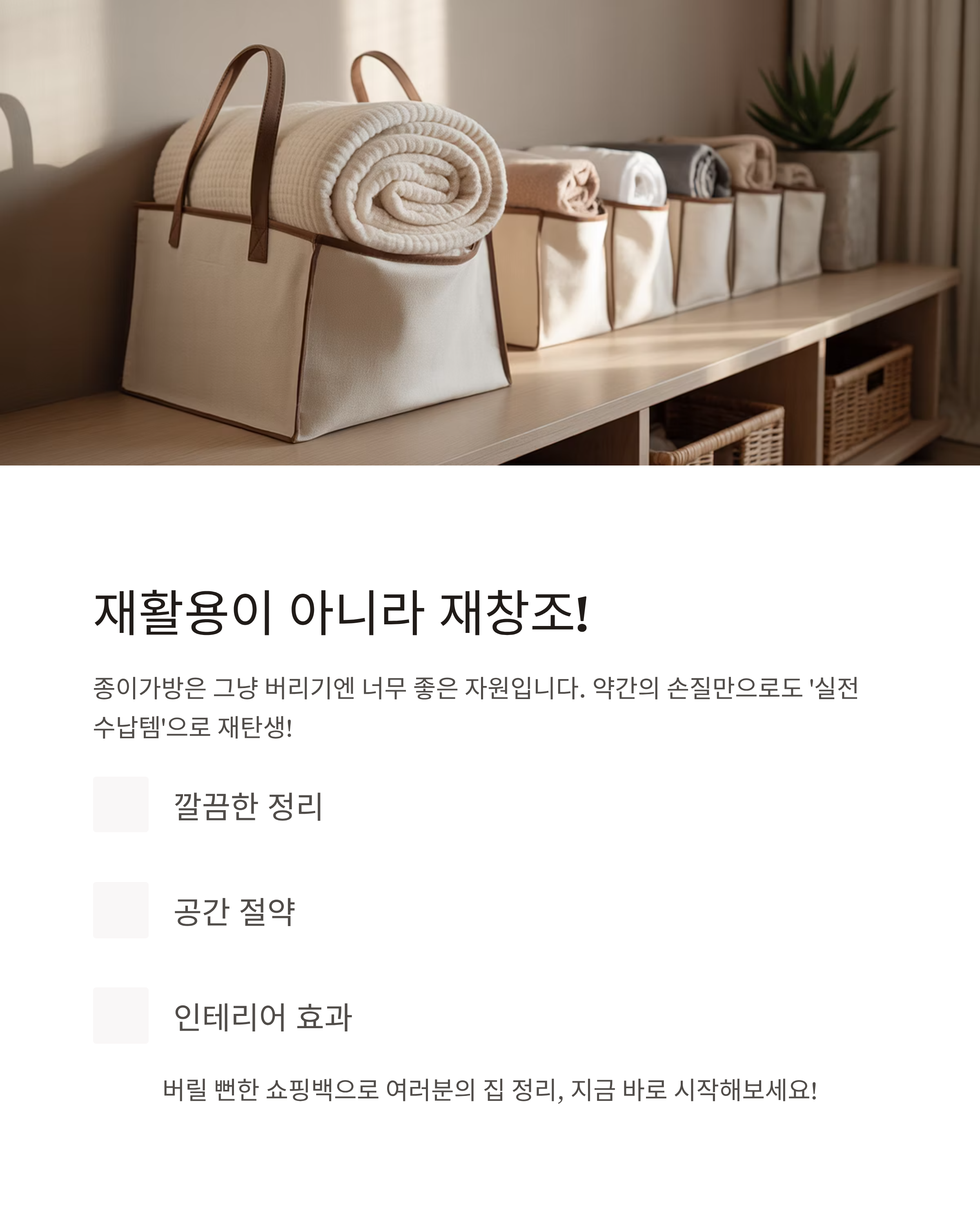 버릴 뻔한 쇼핑백으로 여러분의 집 정리, 지금 바로 시작해 보세요.