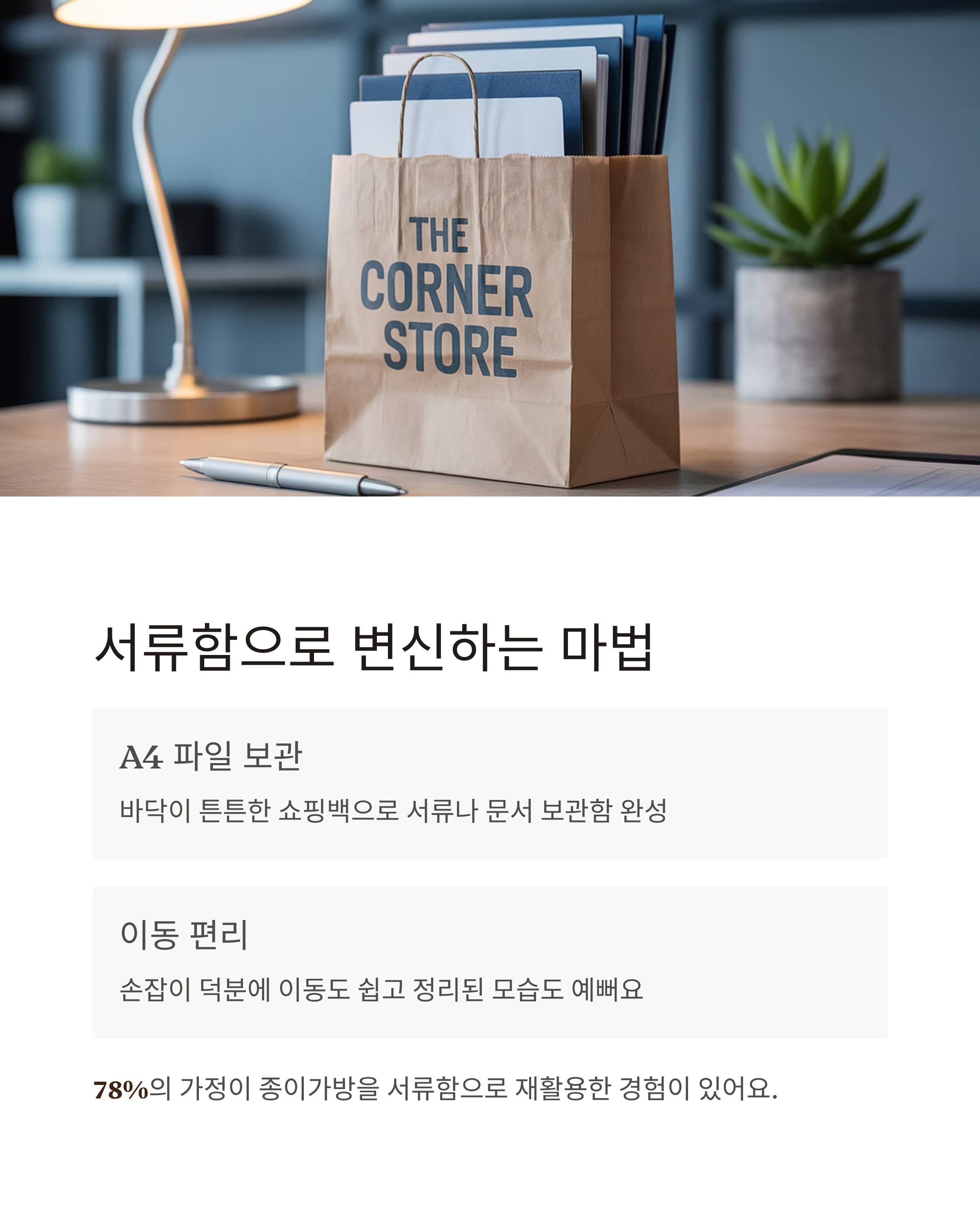 | 서류 정리함 | 책상, 사무실 | 종이가방+서류+A4 | 깔끔한 정리, 이동 편리 |