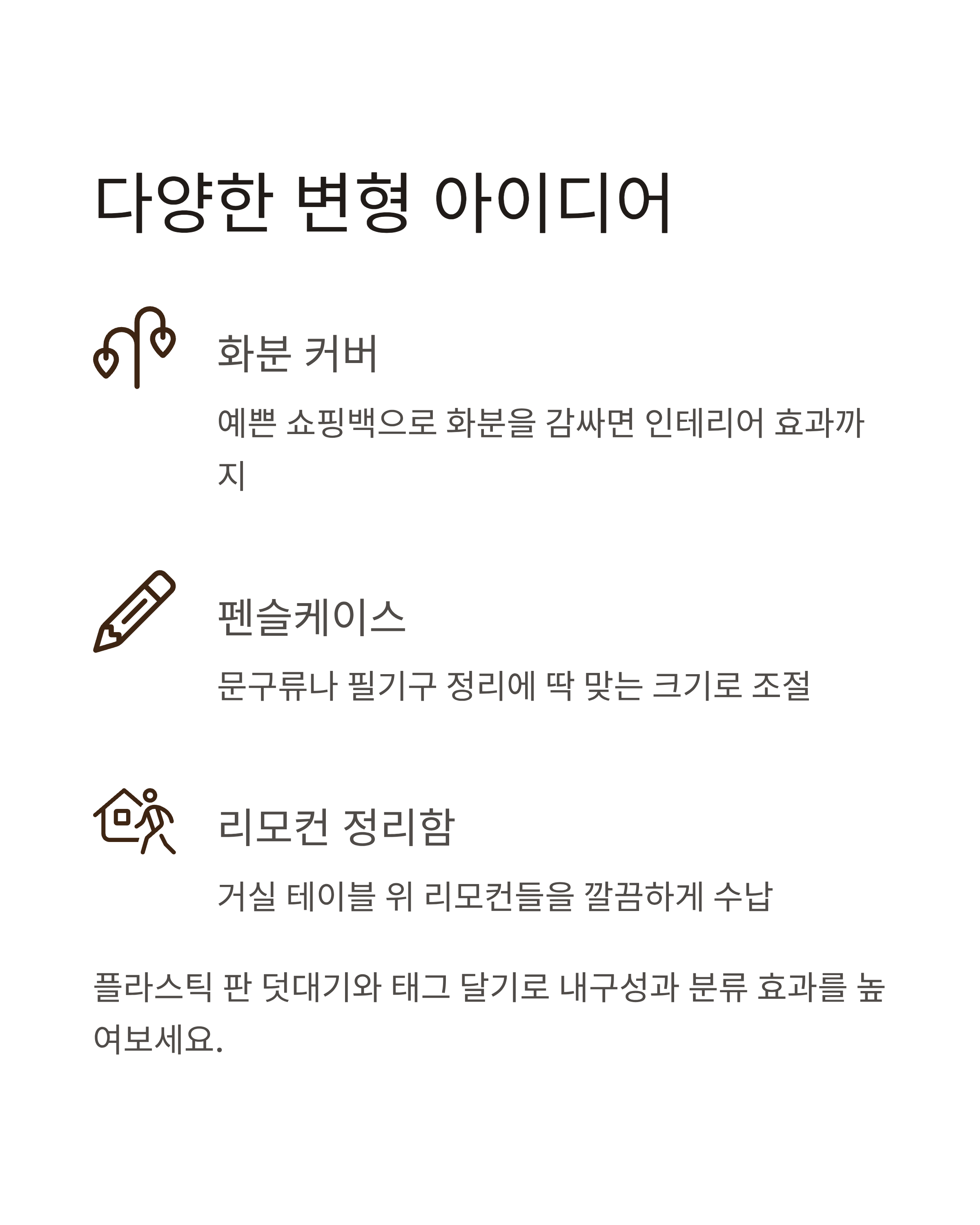 | 잡화 수납함 | 욕실, 거실 | 쇼핑백+내부 보강지 | 양말/화장품 분류 |