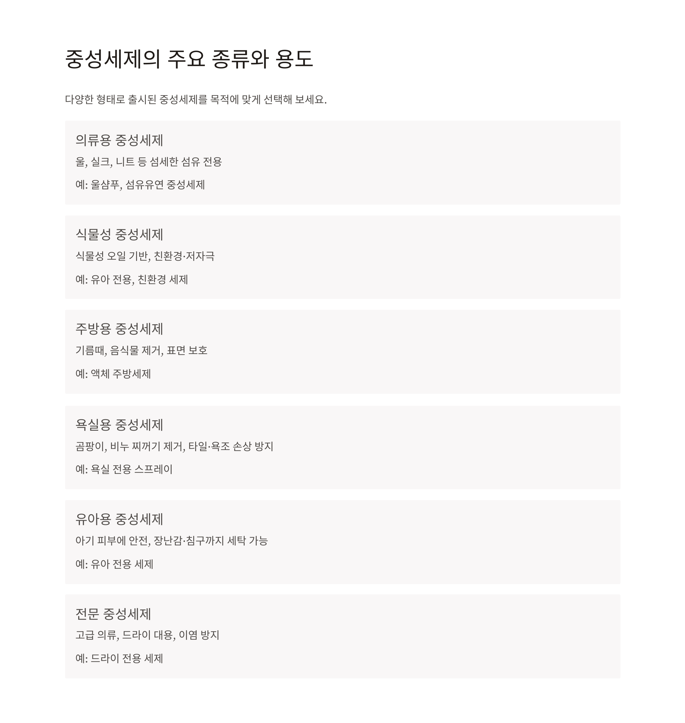 | 의류용 중성세제 | 울, 실크, 니트 등 섬세한 섬유 전용 | 울샴푸, 섬유유연 중성세제 |