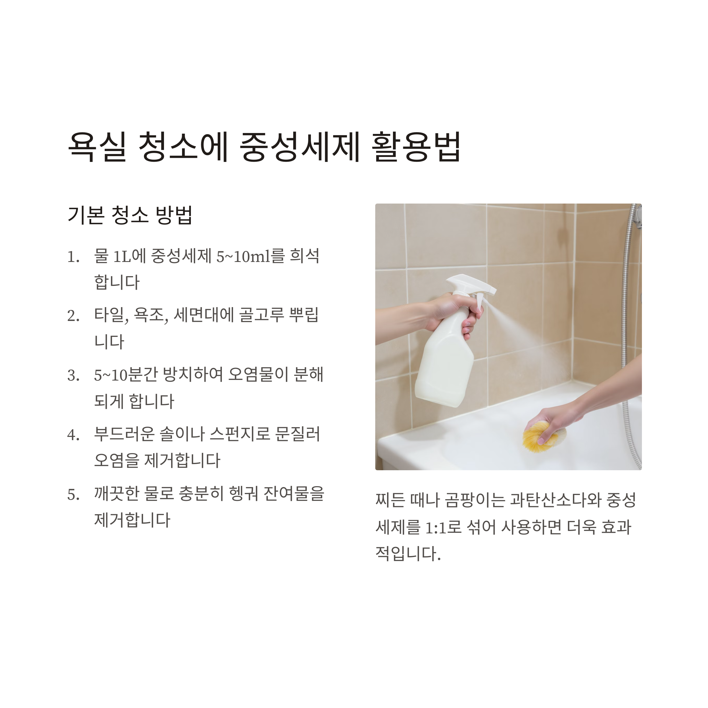 - 물 1L에 중성세제 5~10ml를 풀어 타일, 욕조, 세면대에 뿌린 후 5~10분 방치합니다.
