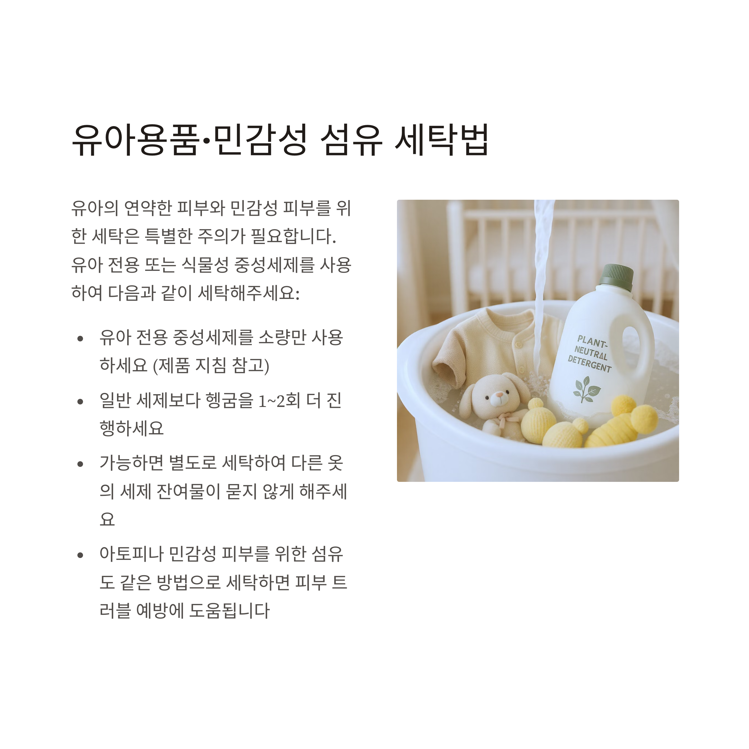 | 유아용품 | 유아 전용 소량, 충분한 헹굼 | 피부 자극 최소화 |