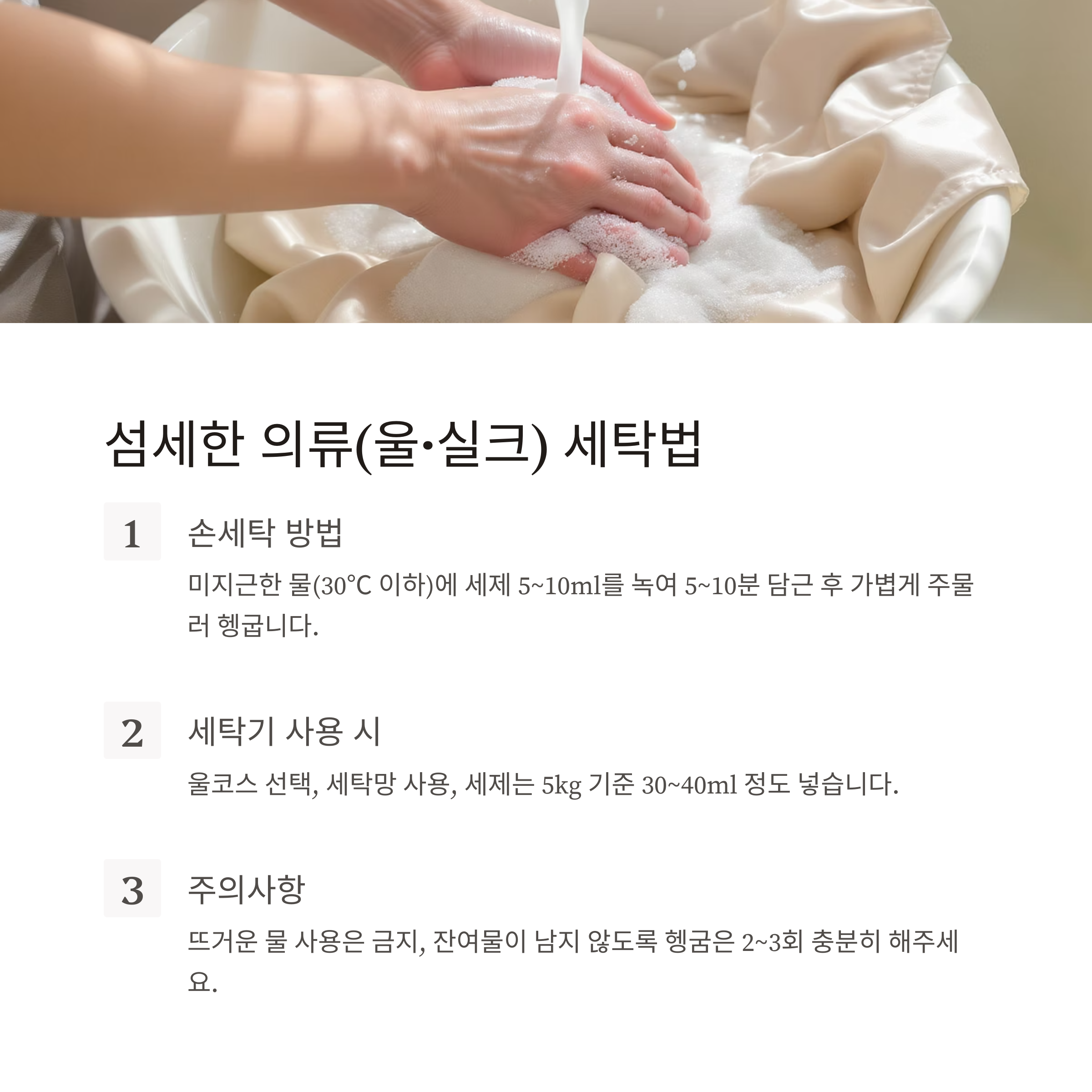 | 의류 손세탁 | 1kg당 5~10ml, 30℃ 이하 | 섬유 손상 최소, 색상 유지 |