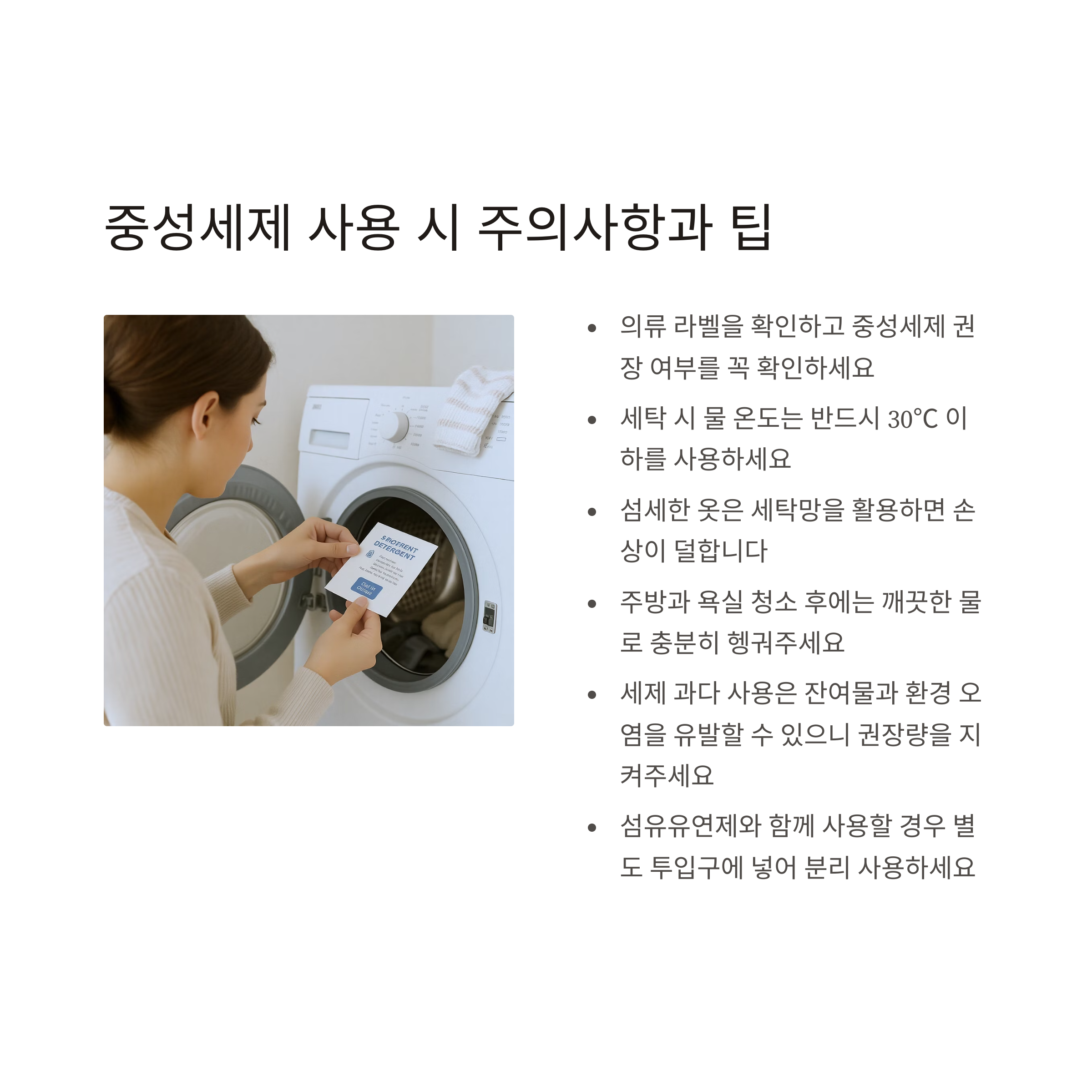 - 의류 라벨을 확인하고 중성세제 권장 여부를 꼭 확인하세요.