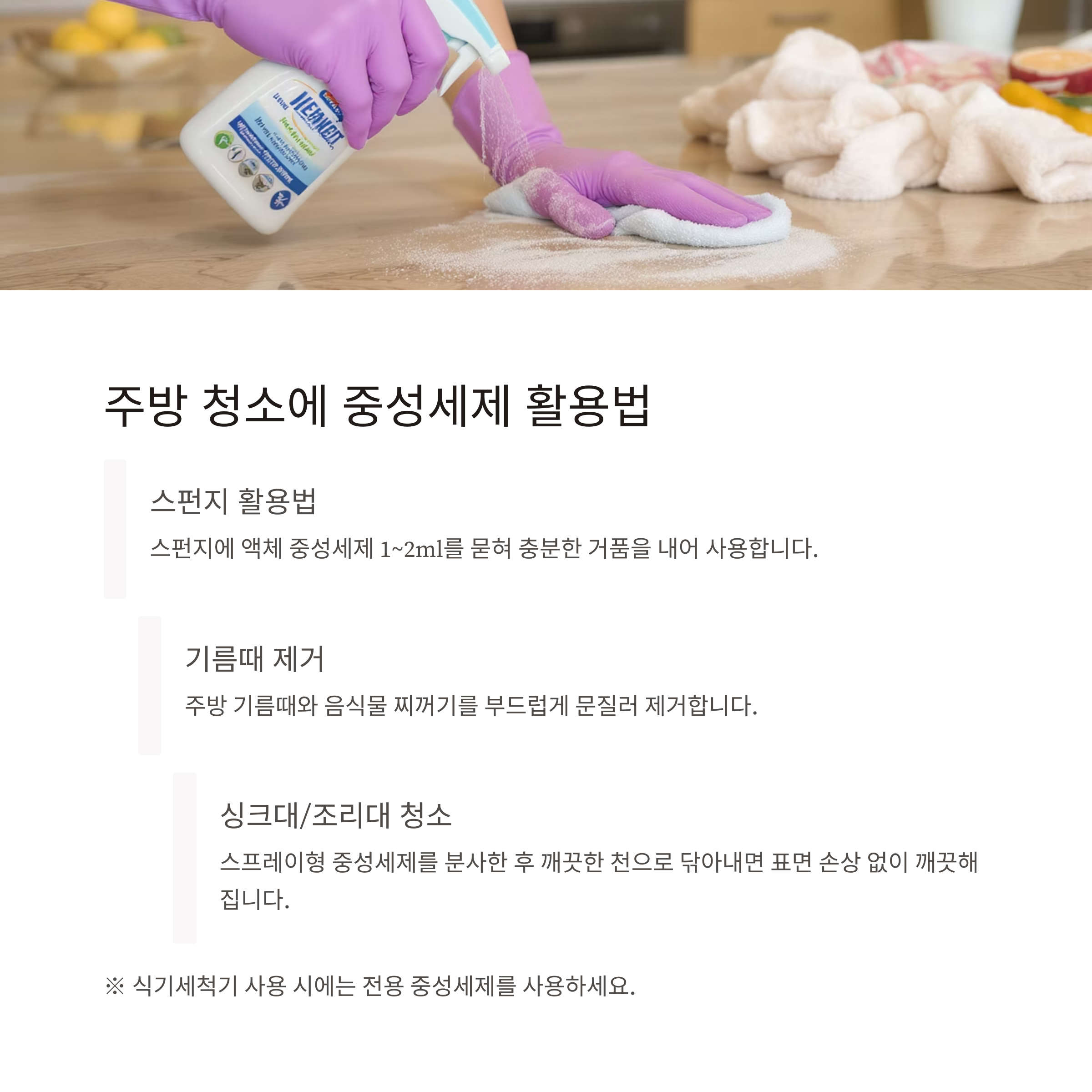 | 주방용 중성세제 | 기름때, 음식물 제거, 표면 보호 | 액체 주방세제 |
