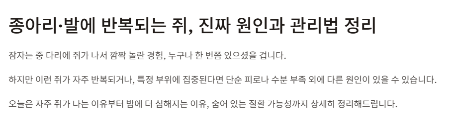 오늘은 자주 쥐가 나는 이유부터 밤에 더 심해지는 이유, 숨어 있는 질환 가능성까지 상세히 정리해 드립니다.