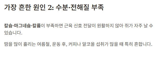 | 흔한 원인 | 근육 피로, 전해질 부족, 혈액순환 저하 |
