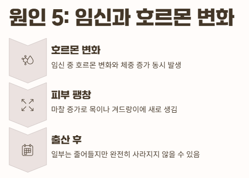 피부가 팽창하고 마찰이 늘어나면서 목이나 겨드랑이에 쥐젖이 새로 생기거나 커질 수 있습니다.