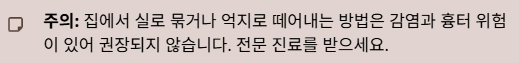 집에서 실로 묶거나 억지로 떼어내는 방법은 감염과 흉터 위험이 있어 권장되지 않습니다.