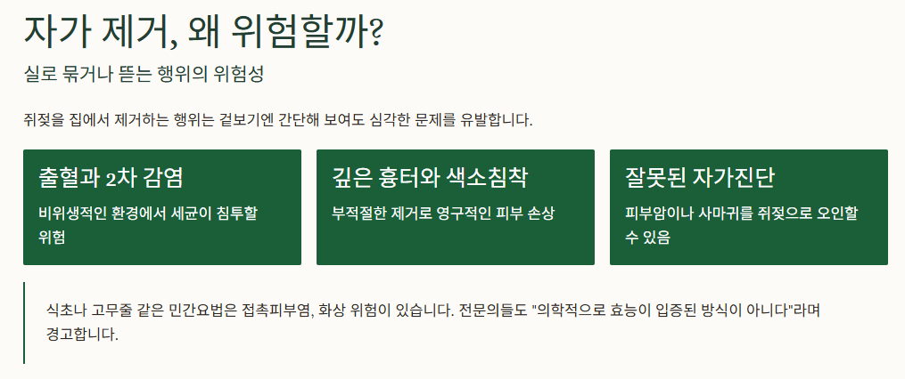 인터넷에는 실로 묶거나 식초를 바르는 민간요법이 돌아다니지만, 실제로는 피부염, 감염, 흉터, 색소침착 위험이 커서 권장되지 않습니다.