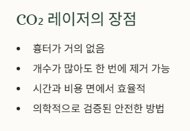 특히 CO₂ 레이저는 흉터도 적고, 개수가 많아도 한 번에 제거가 가능해