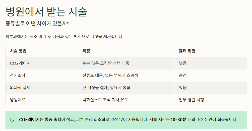 이 중 CO₂ 레이저는 통증·출혈이 적고, 피부 손상도 최소화되어 가장 많이 쓰입니다.