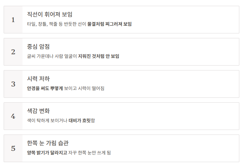 | 4. 중심이 안 보이거나 흐림 | 즉시 안과 진료 권장 |