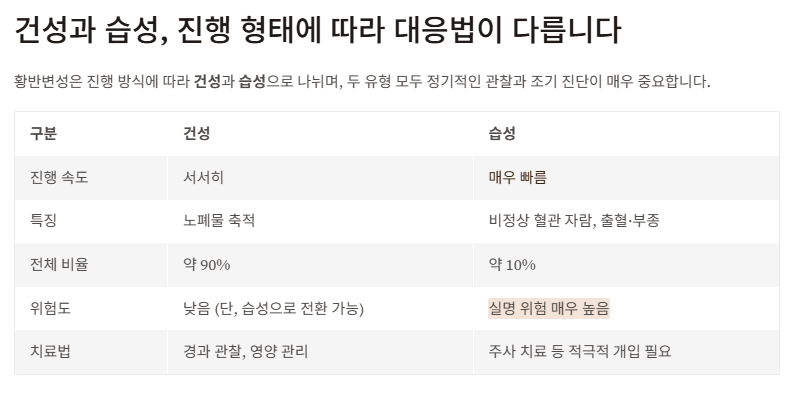 황반변성은 진행 방식에 따라 건성과 습성으로 나뉘며,