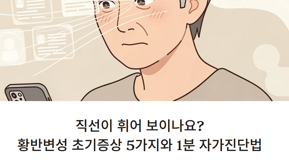 스마트폰 화면이 흐릿하게 보이거나 타일의 직선이 물결처럼 휘어 보인 적 있으신가요? 단순히 눈이 피곤해서 그러려니 넘기셨다면, 지금 이 글을 끝까지 읽어보셔야 합니다. 나도 모르게 진행될 수 있는 실명의 주범, 황반변성일 가능성이 있기 때문입니다. 오늘은 황반변성의 초기 증상부터 자가 진단법까지 핵심만 간단히 정리해 드립니다.