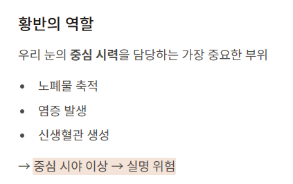 | 특징 | 노폐물 축적 | 비정상 혈관 자람, 출혈·부종 |