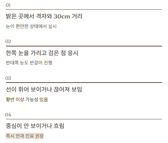 | 1. 밝은 곳에서 격자와 30cm 거리 | 눈이 편안한 상태에서 실시 |