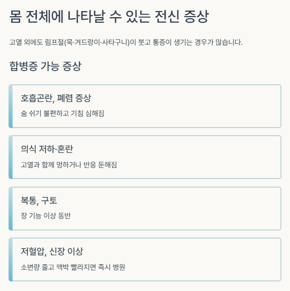 고열 외에도 림프절(목·겨드랑이·사타구니)이 붓고 통증이 생기는 경우가 많습니다.