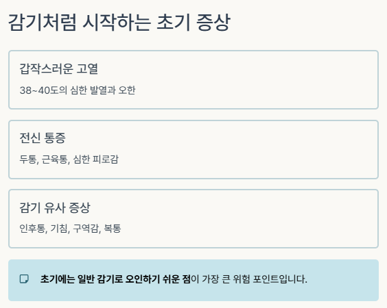 | 초기 증상 | 고열, 두통, 오한, 피로, 위장 증상 |