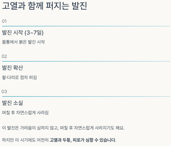 이 발진은 가려움이 심하지 않고, 며칠 후 자연스럽게 사라지기도 해요.