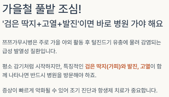 쯔쯔가무시병은 조기 진단만 되면 항생제로 빠르게 호전되지만, 늦어지면 생명을 위협할 수 있습니다. 다음 증상이 있다면 병원 진료를 미루지 마세요.