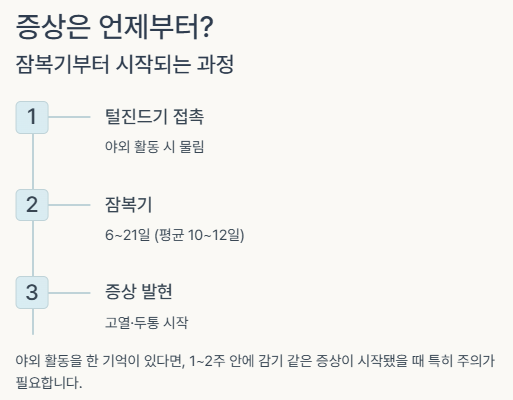 야외 활동을 한 기억이 있다면, 1~2주 안에 감기 같은 증상이 시작됐을 때 특히 주의가 필요합니다.