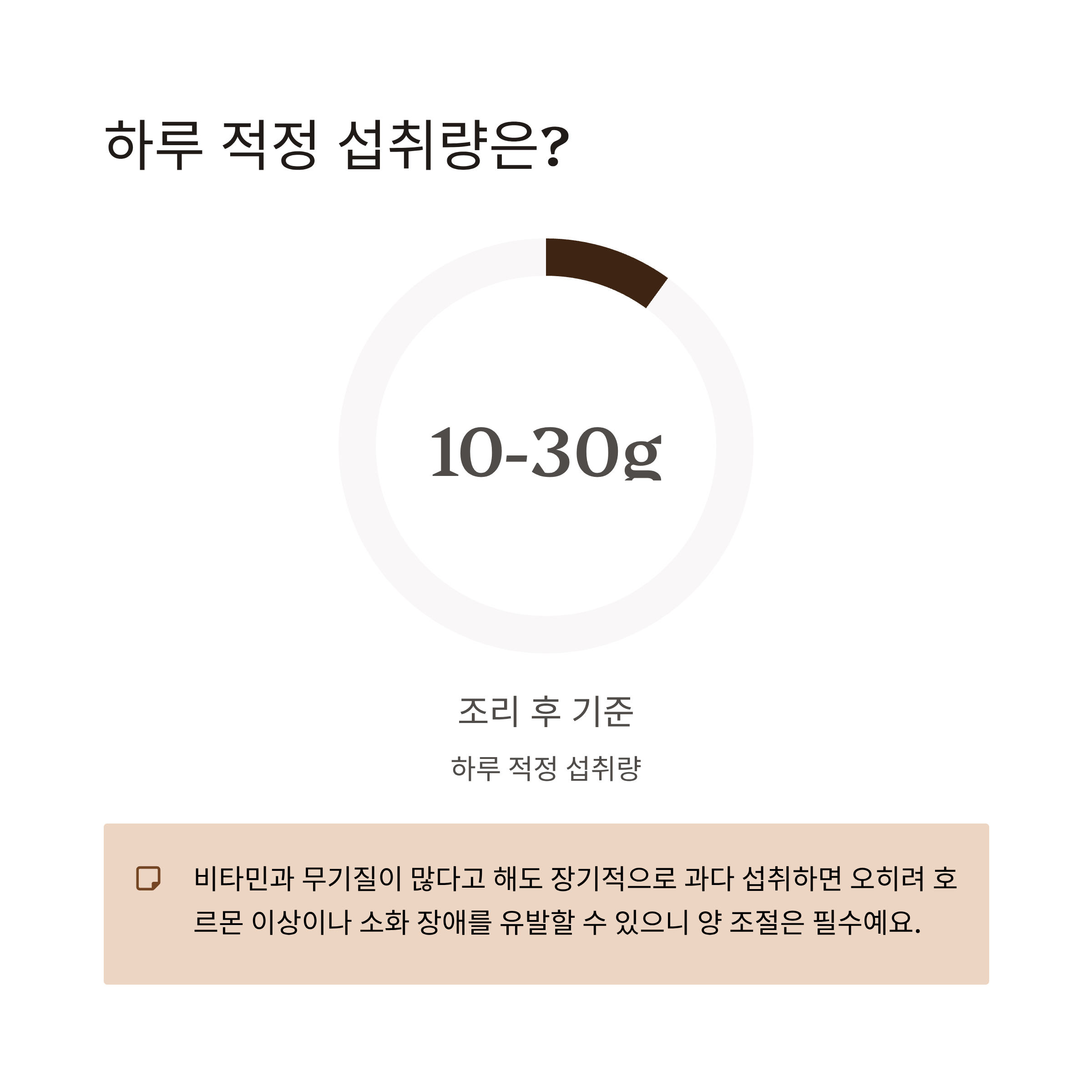 갑상선 질환자 및 임산부는 섭취량을 조절하거나 전문가와 상담 필요. - 중금속 주의