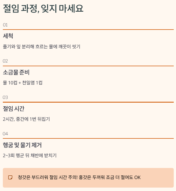 | 소금물 준비 | 물 10컵 + 천일염 1컵 |