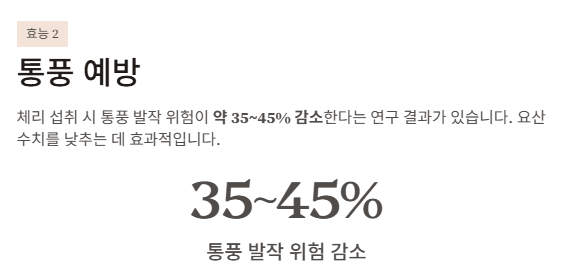 실제 연구에서 체리를 섭취한 사람은 통풍 발작 위험이 약 35~45% 감소한 것으로 보고되었습니다.