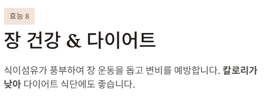 식이섬유가 풍부하여 장 운동을 돕고 변비 예방에 효과적입니다.
