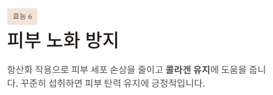 항산화 작용으로 피부 세포 손상을 줄이고 콜라겐 유지에 도움을 줍니다.