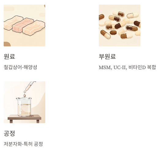 | 부원료 | 단일/기초 부원료 | MSM, UC-II, 비타민D 등 복합 |