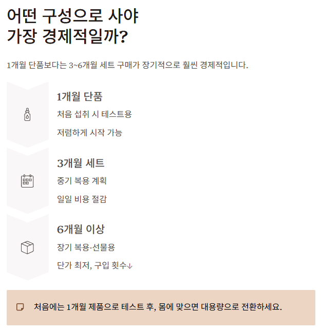 | 6개월 이상 | 장기 복용 계획자·선물용 | 단가 최저, 구입 횟수↓ |
