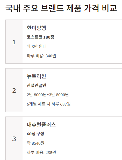 | 브랜드 | 1일 섭취 비용 | 구성 기준 |