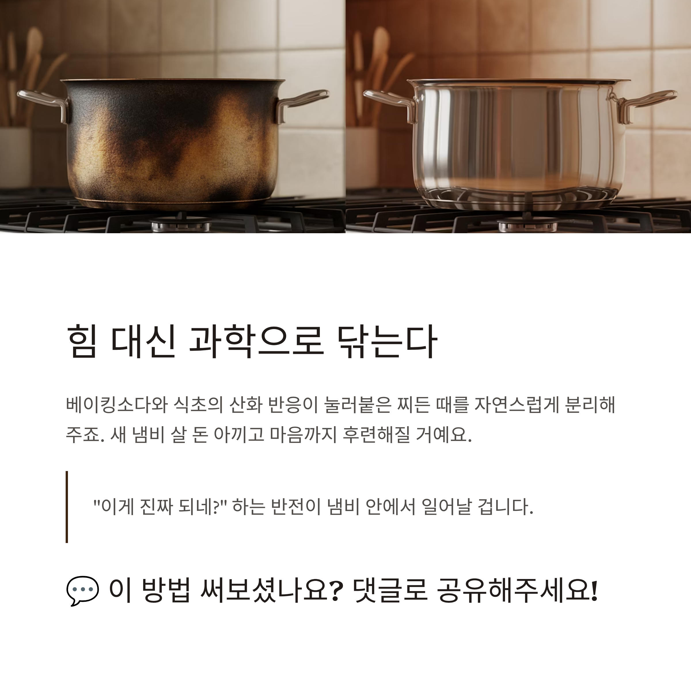 | 스테인리스, 코팅냄비 | 베이킹소다 + 식초 | 표면 손상 없음 |
