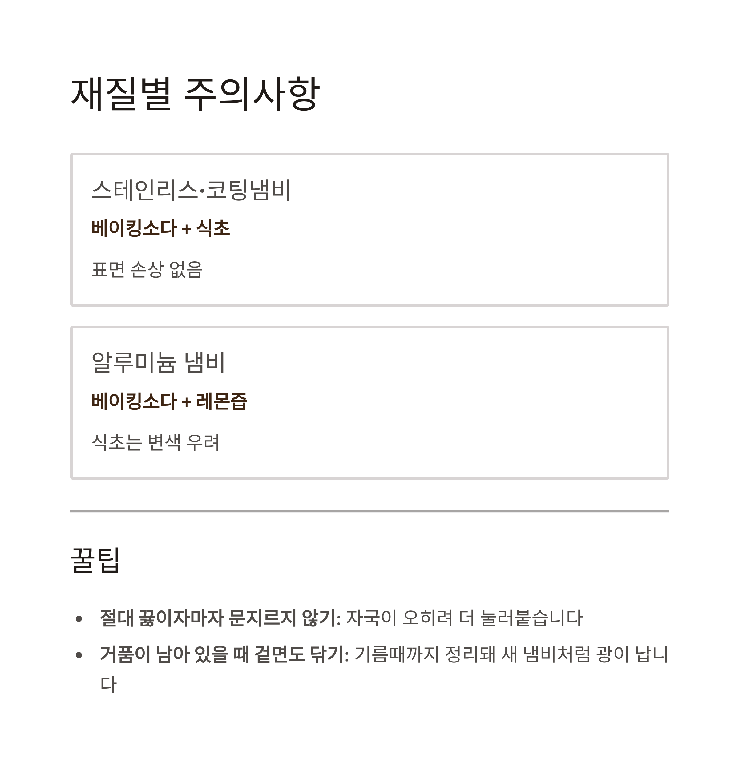 | 알루미늄 냄비 | 베이킹소다 + 레몬즙 | 식초는 변색 우려 |