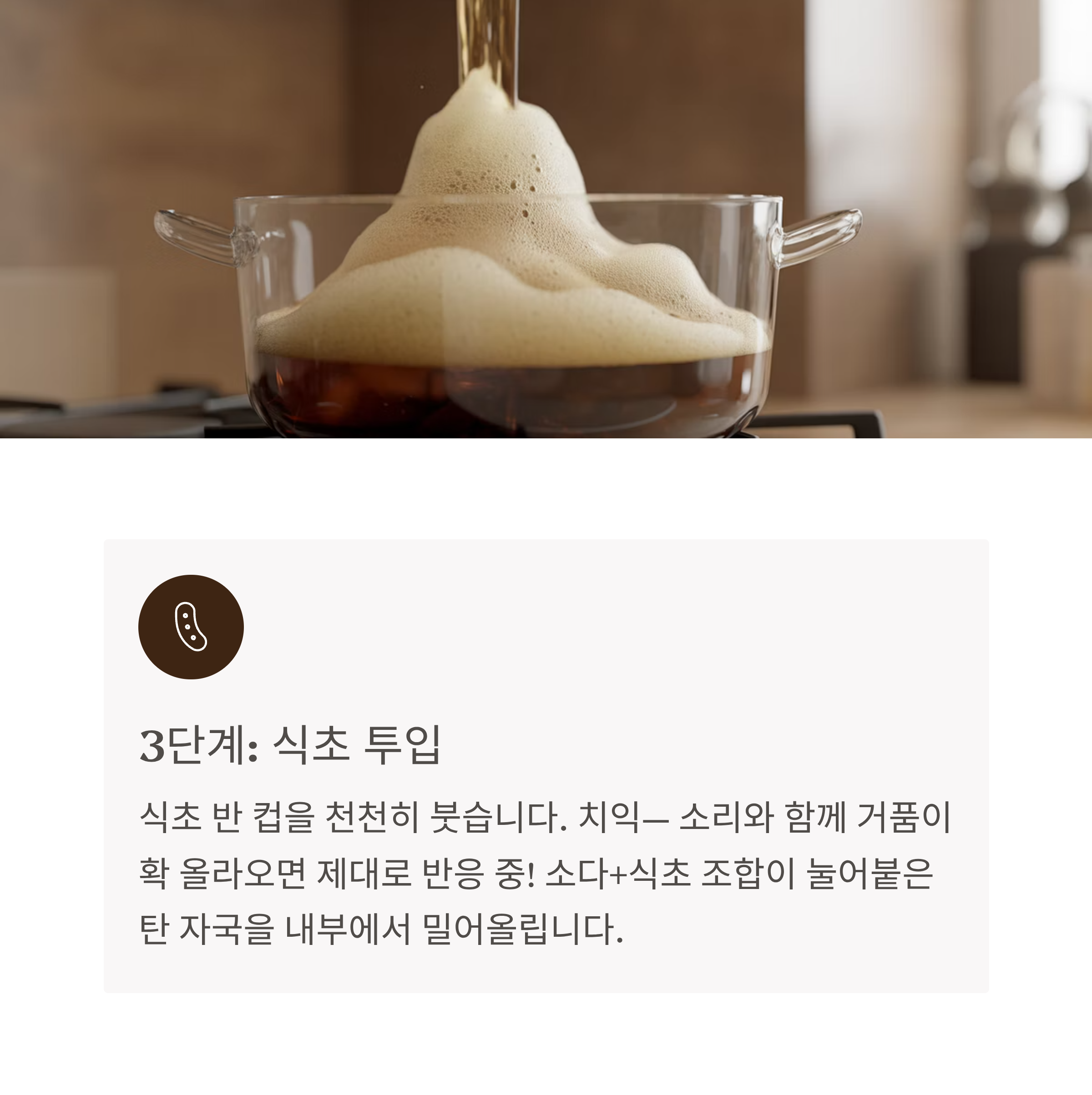 소다+식초 조합이 눌어붙은 탄 자국을 내부에서 밀어올립니다.