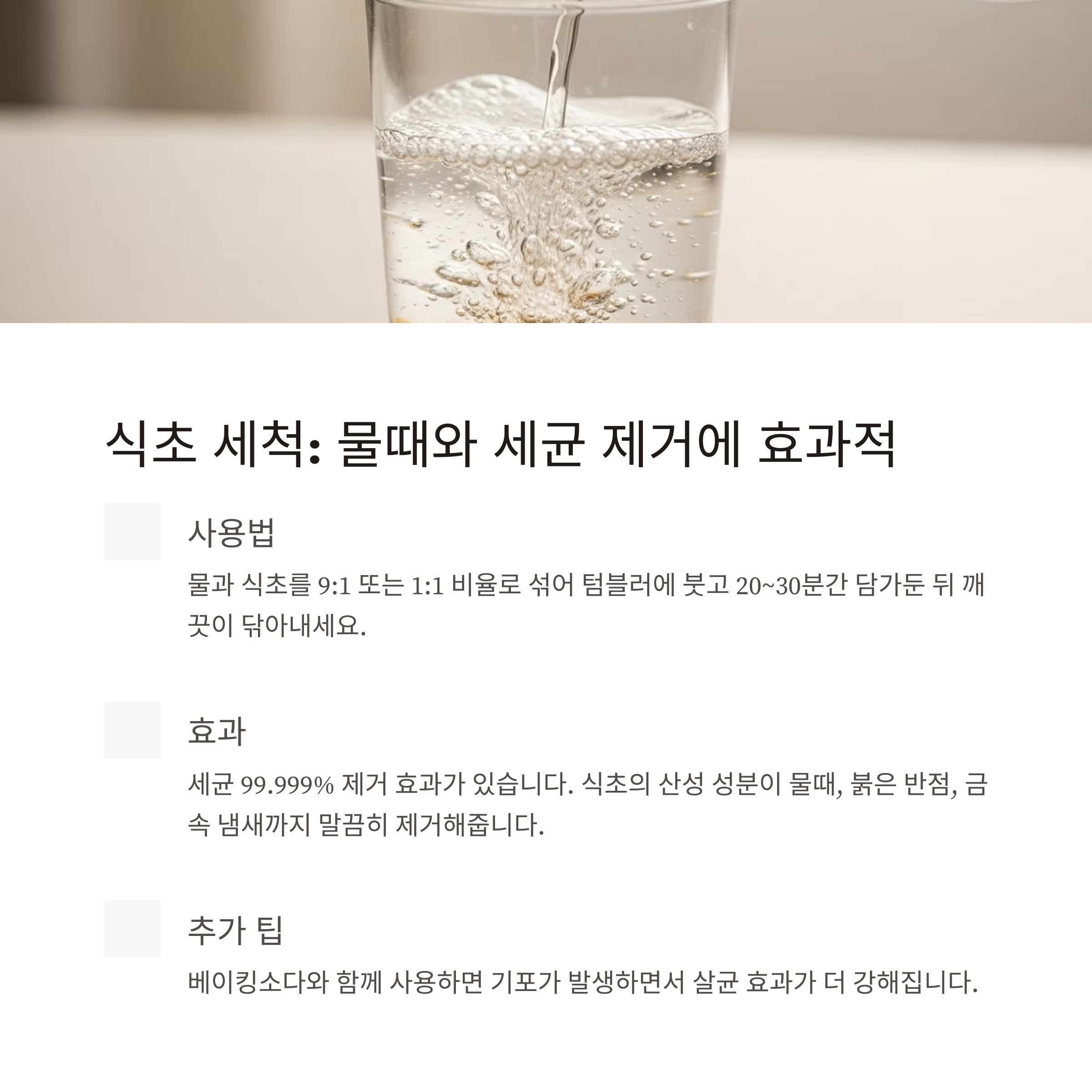 | 식초 | 물:식초=9:1~1:1 | 20~30분 | 세균·물때 99.9% | 냄새는 자연 소멸 |