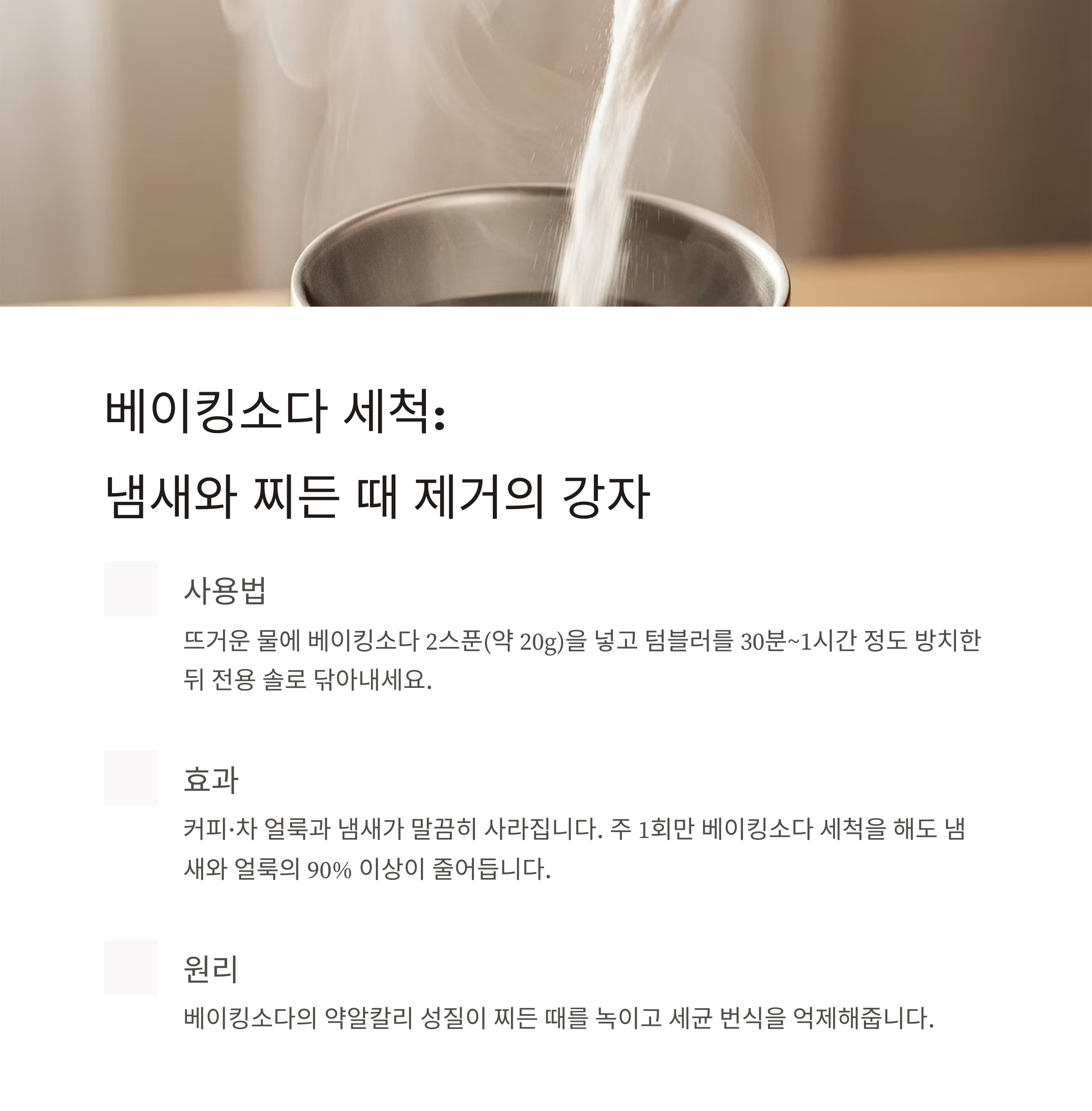 | 베이킹소다 | 2스푼+뜨거운 물 | 30~60분 | 냄새·찌든 때 90% | 플라스틱은 미지근한 물 |
